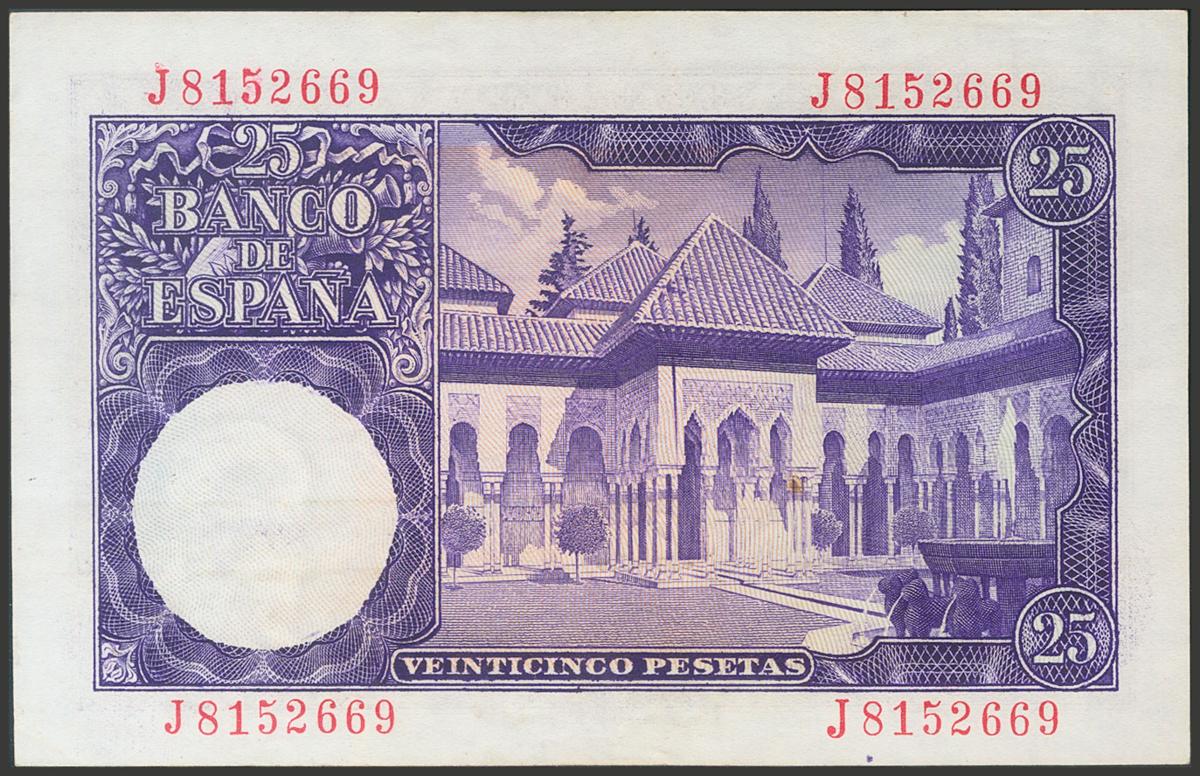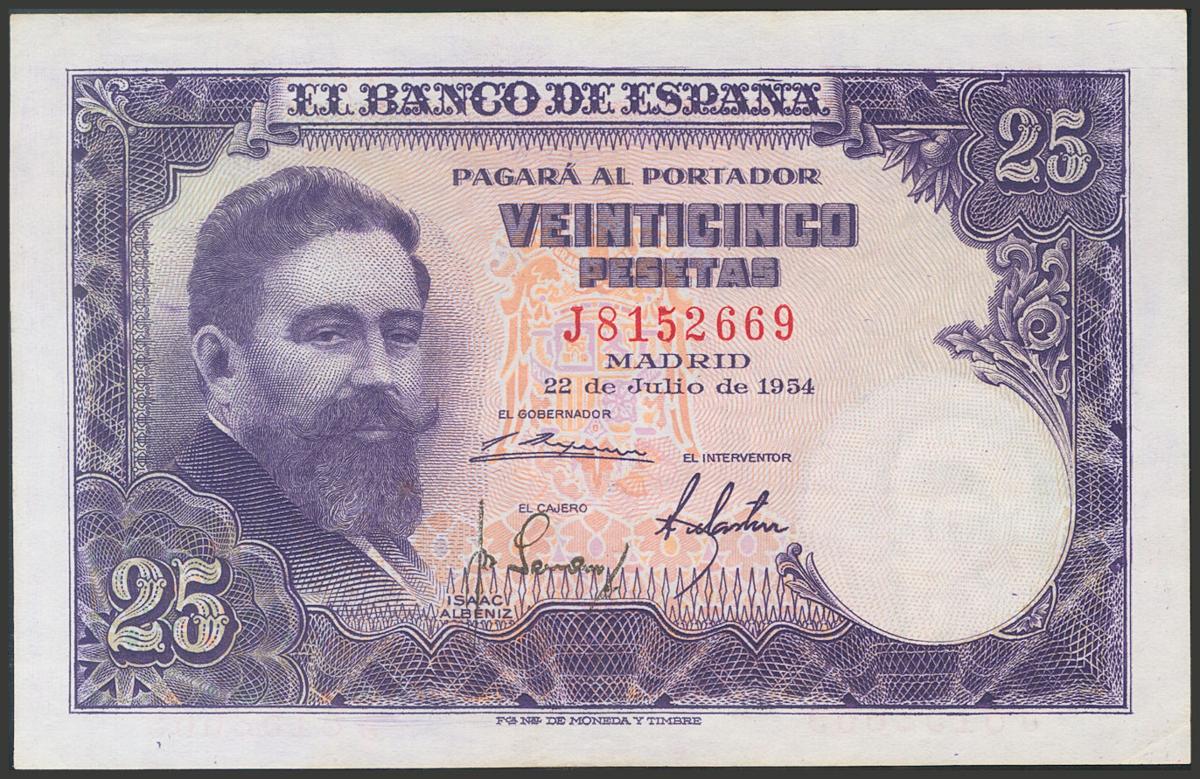 English 25 Pesetas. July 22, 1954. Series J. (Edifil 2017: 467a). Retains part of the original size. Good Extremely Fine.