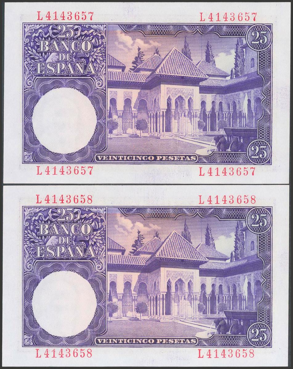 25 Pesetas. July 22, 1954. Correlative couple. Series L. (Edifil 2017: 467a). Uncirculated.