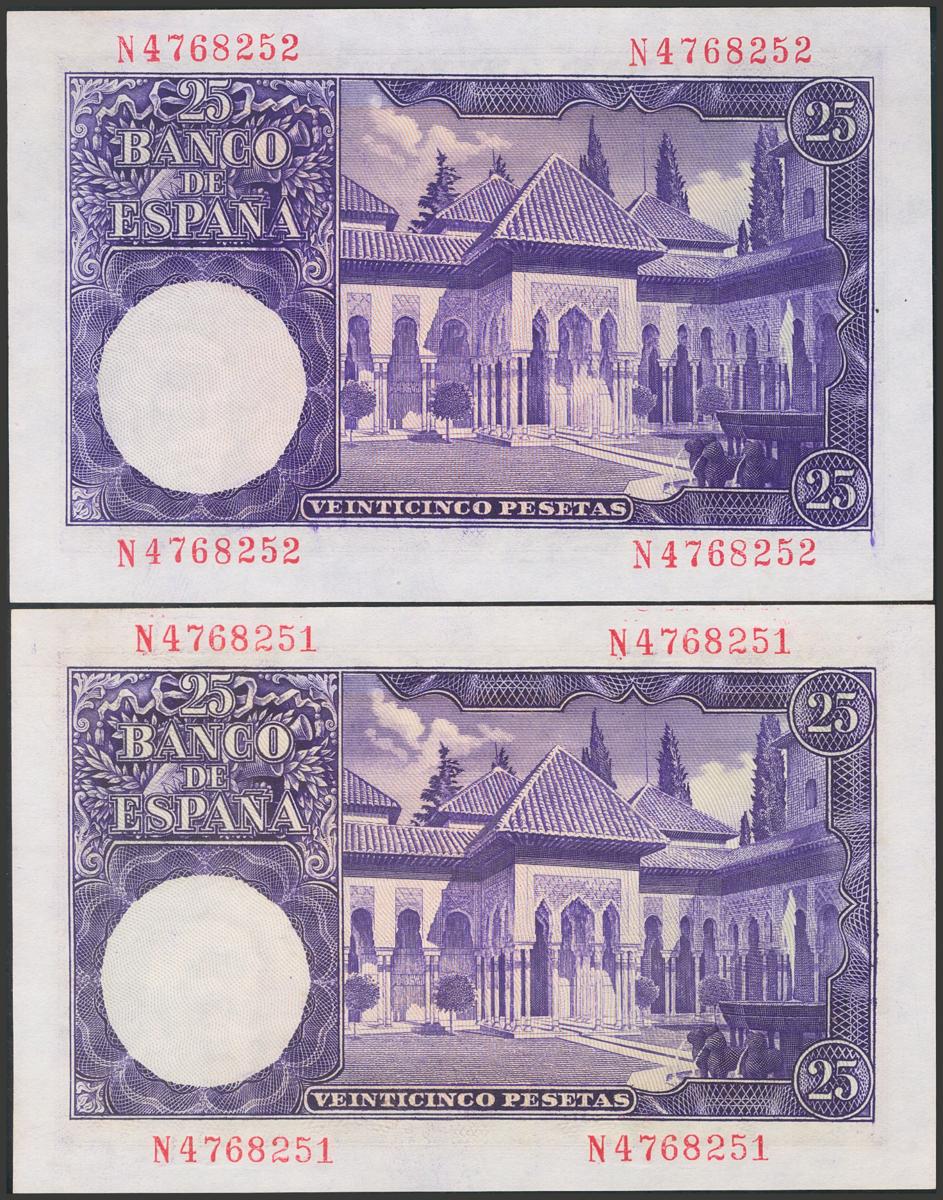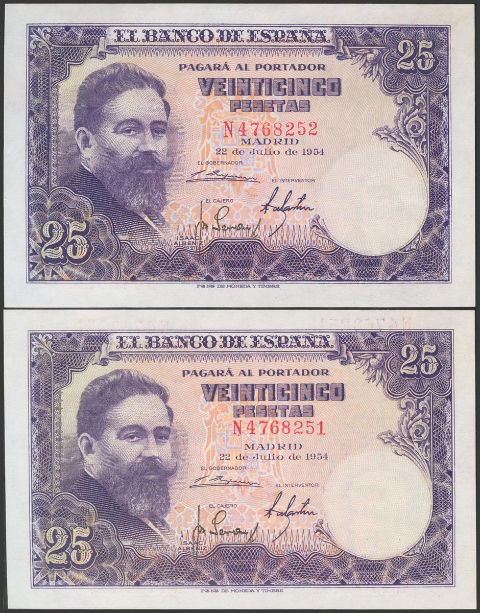 25 Pesetas. July 22, 1954. Correlative couple. Series N. (Edifil 2017: 467a). It keeps all its original size. Uncirculated.