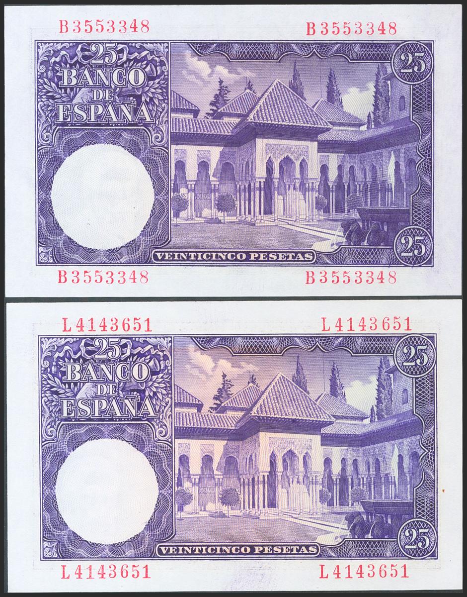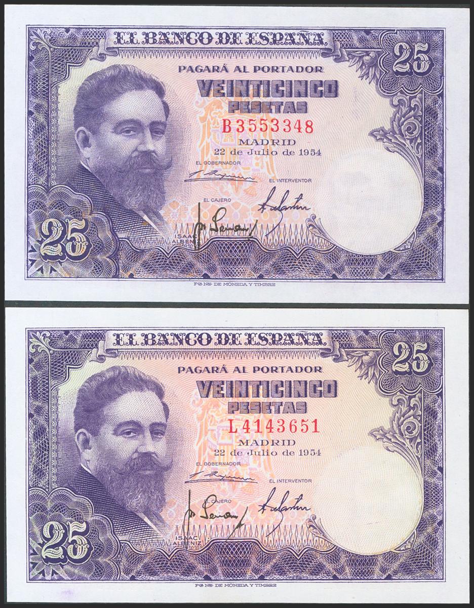 Set of 2 banknotes of 25 Pesetas issued on July 22, 1954, with series B and L, respectively (Edifil 2017: 467a). Uncirculated.