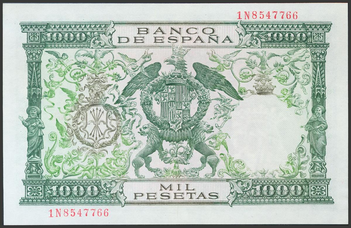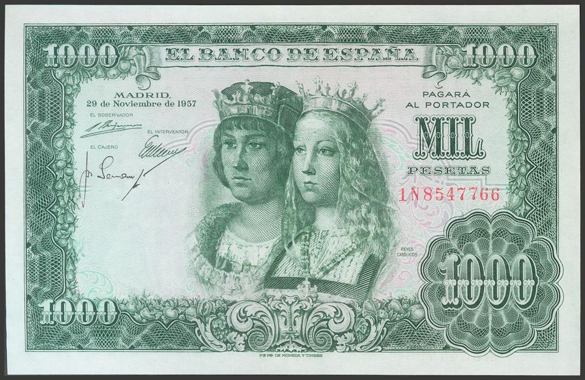 1000 Pesetas. November 29, 1957. Series 1N. (Edifil 2021: 469b). It retains much of the original size. Good Extremely Fine.