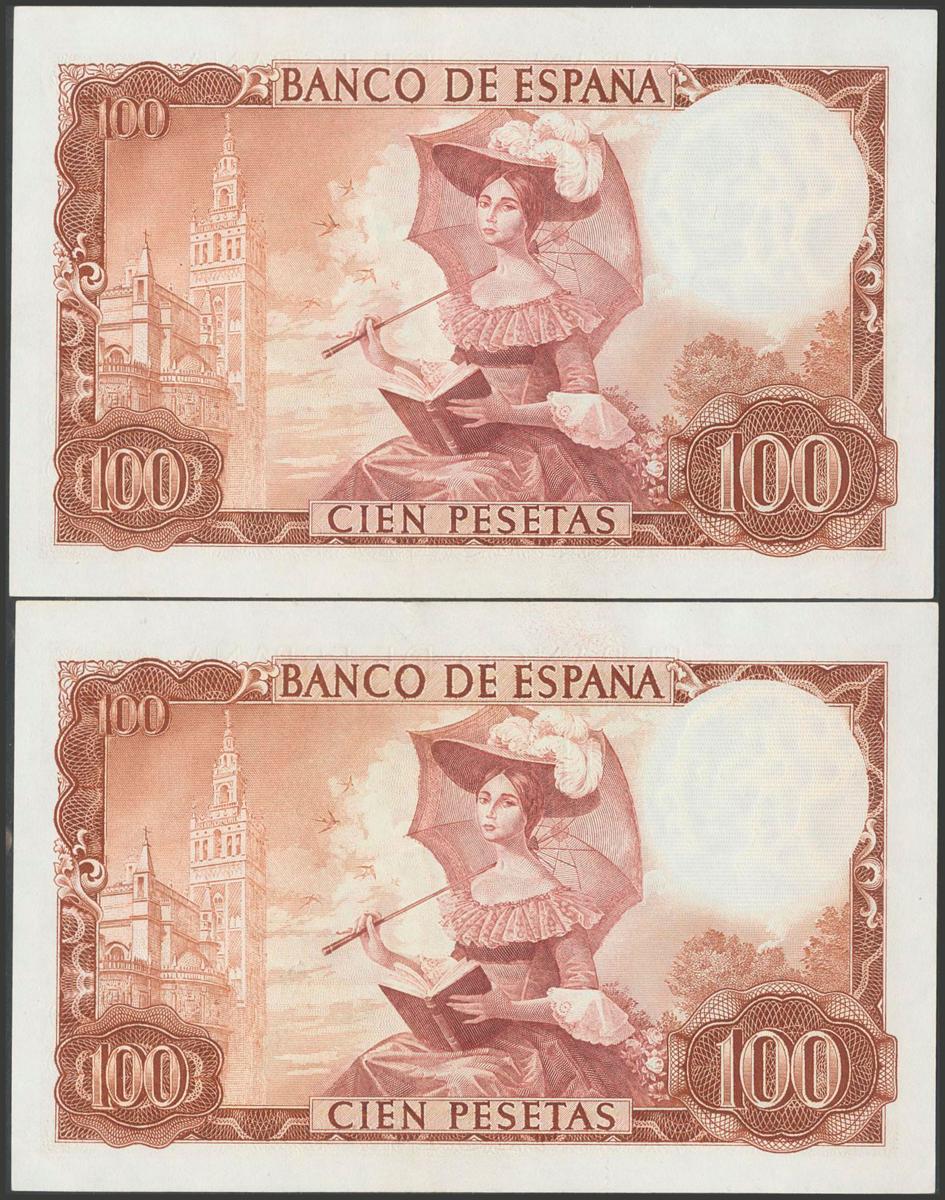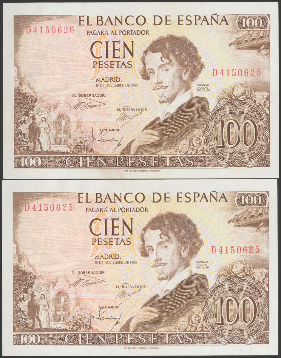 100 pesetas. November 19, 1965. Correlative couple. Series D. (Edifil 2017: 470a). It retains much of the original size. Good Extremely Fine.