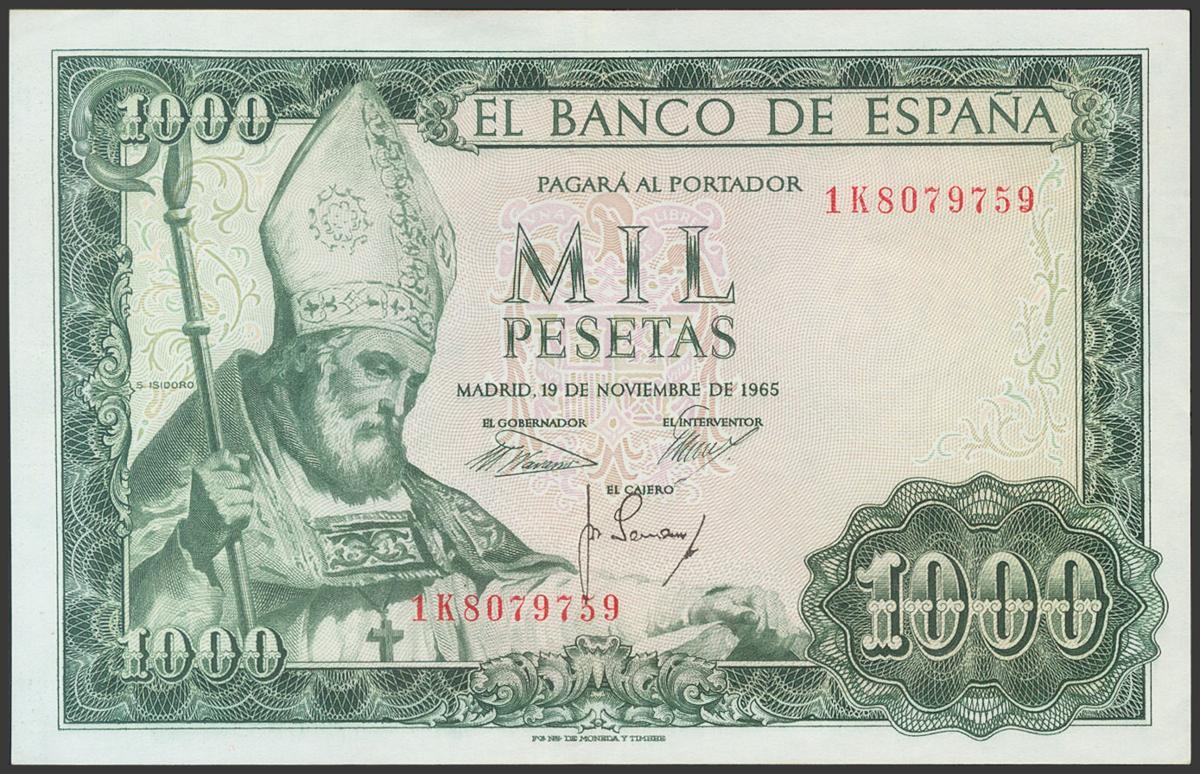 English 1000 Pesetas. November 19, 1965. Series 1K. (Edifil 2017: 471b). Retains part of the original size. Extremely Fine.