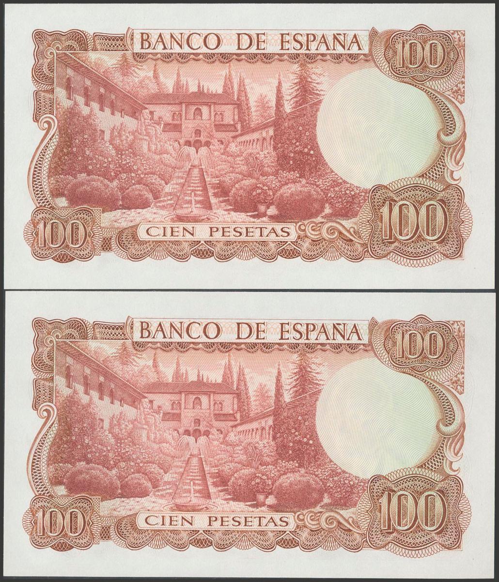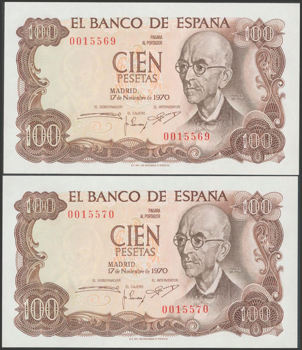 100 pesetas. November 17, 1970. Correlative pair. No series and low numbering. (Edifil 2017: 472). Uncirculated.