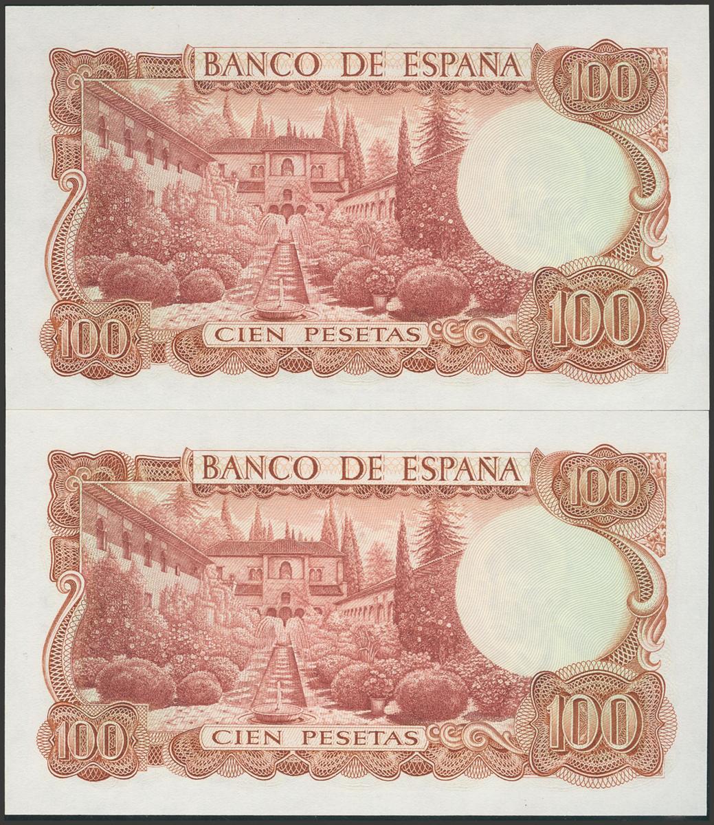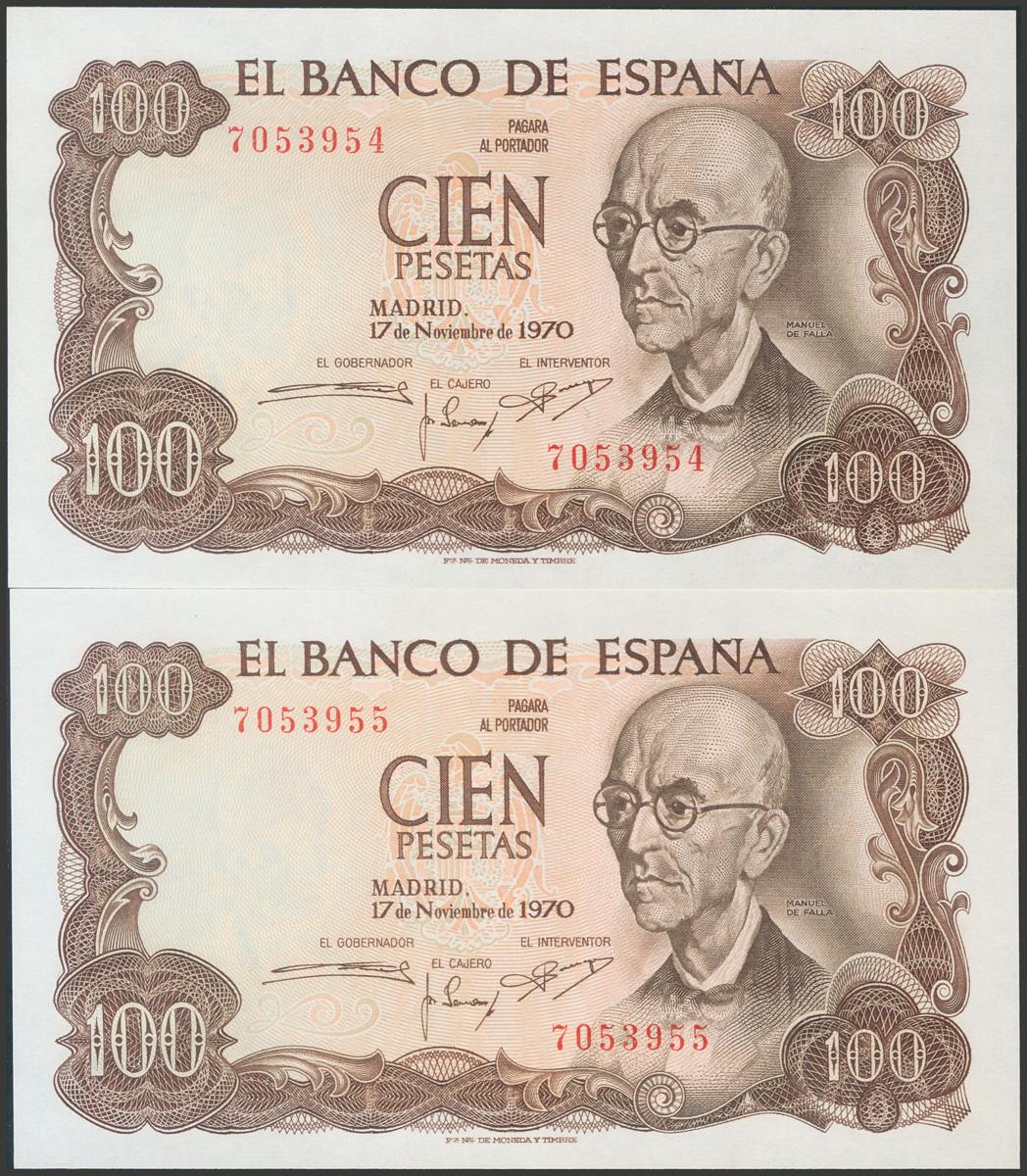 100 pesetas. November 17, 1970. Correlative pair. No serie. (Edifil 2017: 472). It keeps all its original size. Uncirculated.