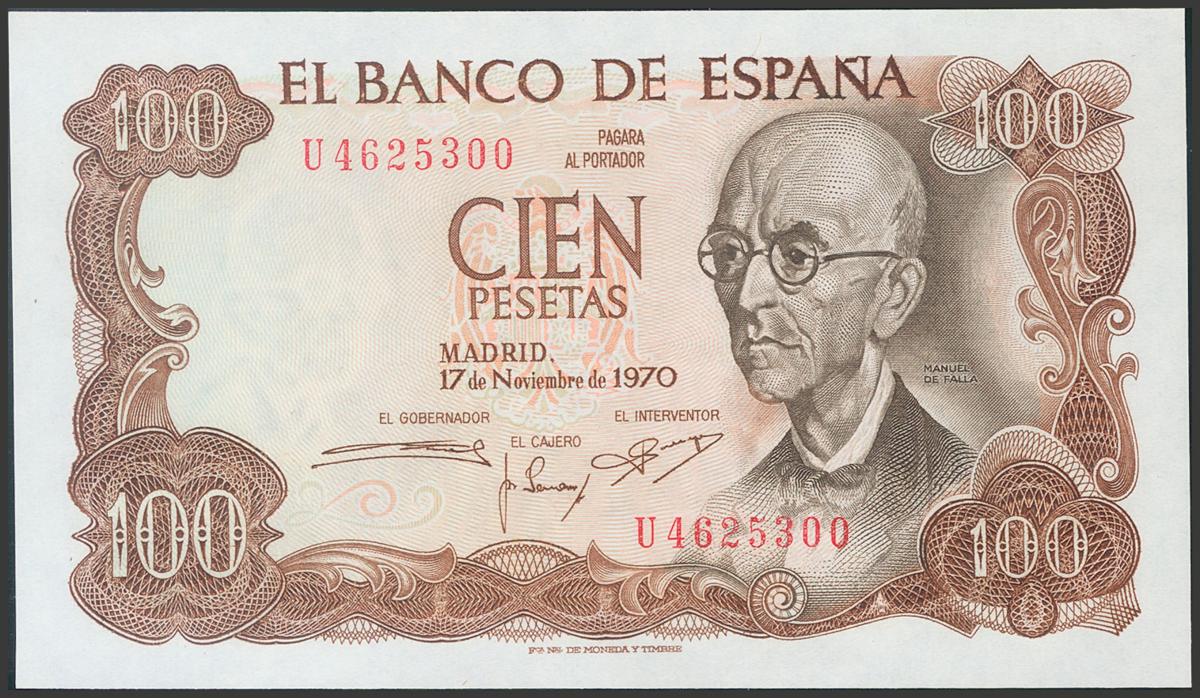 100 pesetas. November 17, 1970. Series U. (Edifil 2017: 472b). Almost Uncirculated.