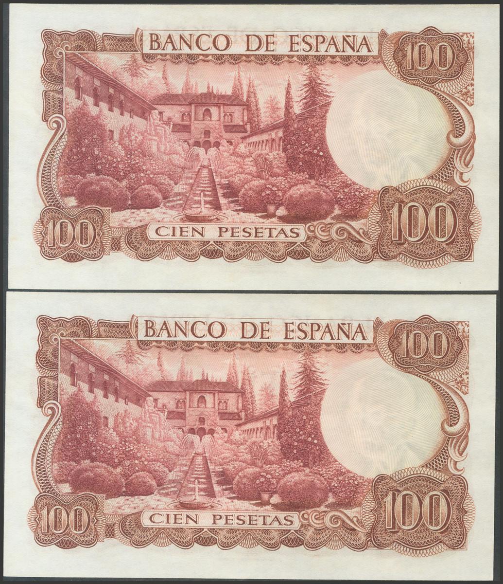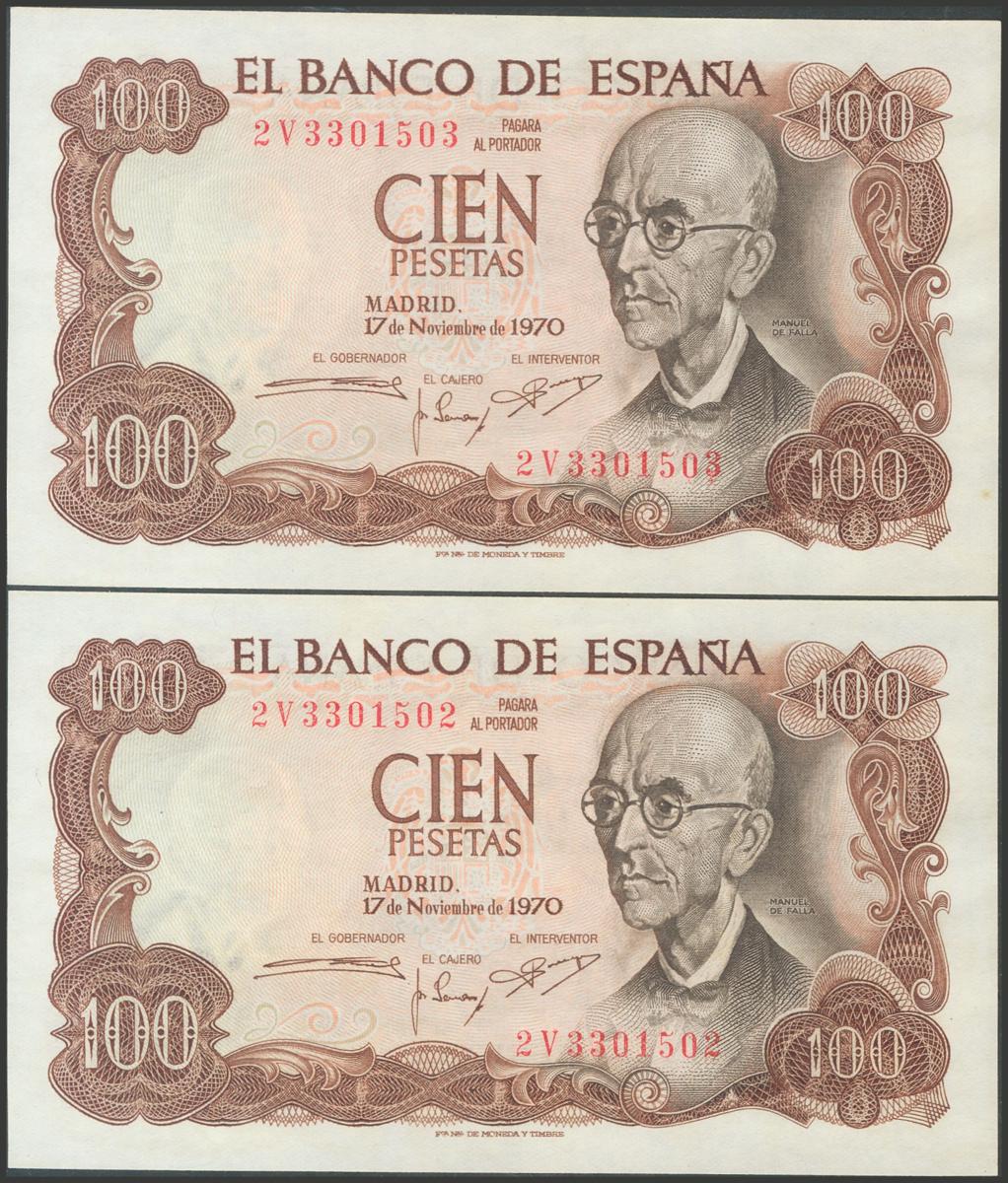 100 pesetas. November 17, 1970. Correlative pair. 2V series. (Edifil 2017: 472c). Original sizing. Almost Uncirculated.