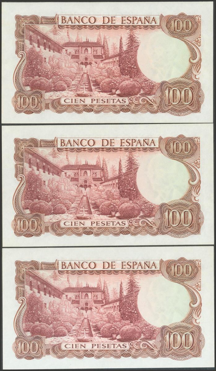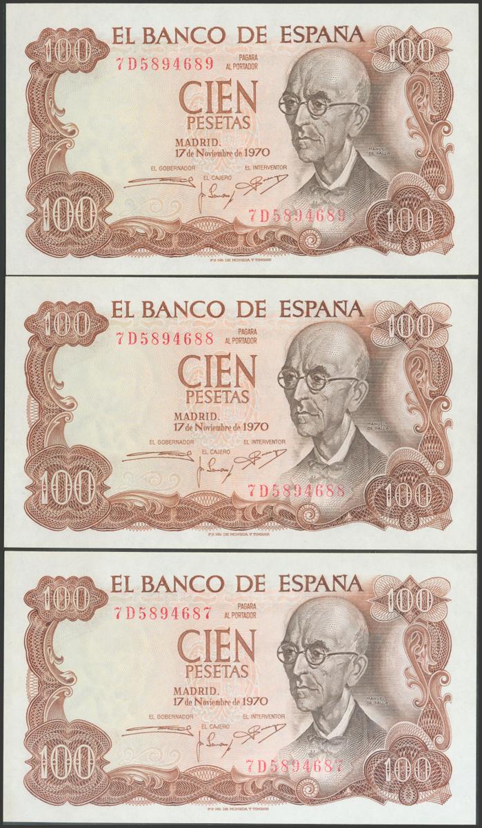 100 pesetas. November 17, 1970. Correlative trio. 7D series. (Edifil 2017: 472c). Original sizing. Almost Uncirculated.