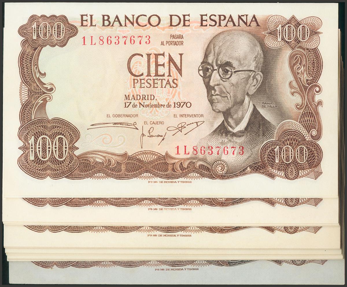 Set of 33 banknotes (many of them correlative) of 100 Pesetas issued on November 17, 1970 with series 1L (2), 2E (9), 4D (4), 4J (3), 4T (10), 6S ( 2), 6Y (2) and 7N (1) (Edifil 2017: 472c). Uncirculated/ Almost Uncirculated.