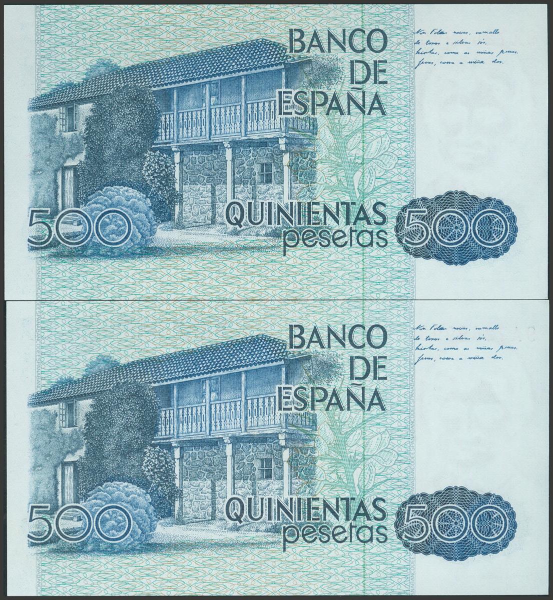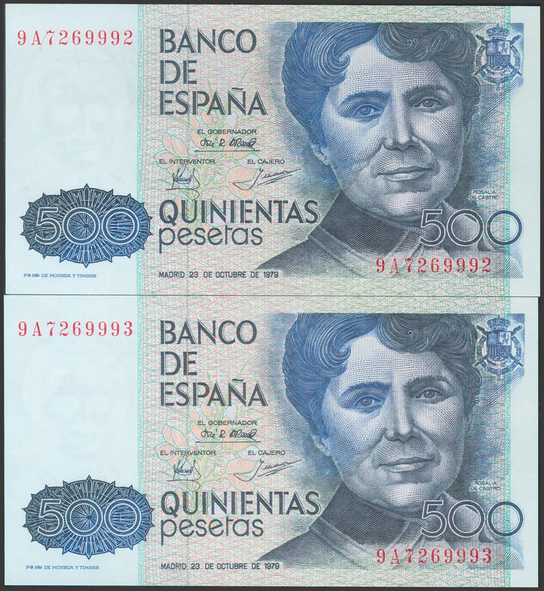 English 500 pesetas. October 23, 1979. Correlative couple. Series 9A, special numbering. (Edifil 2017: 476b). Uncirculated.