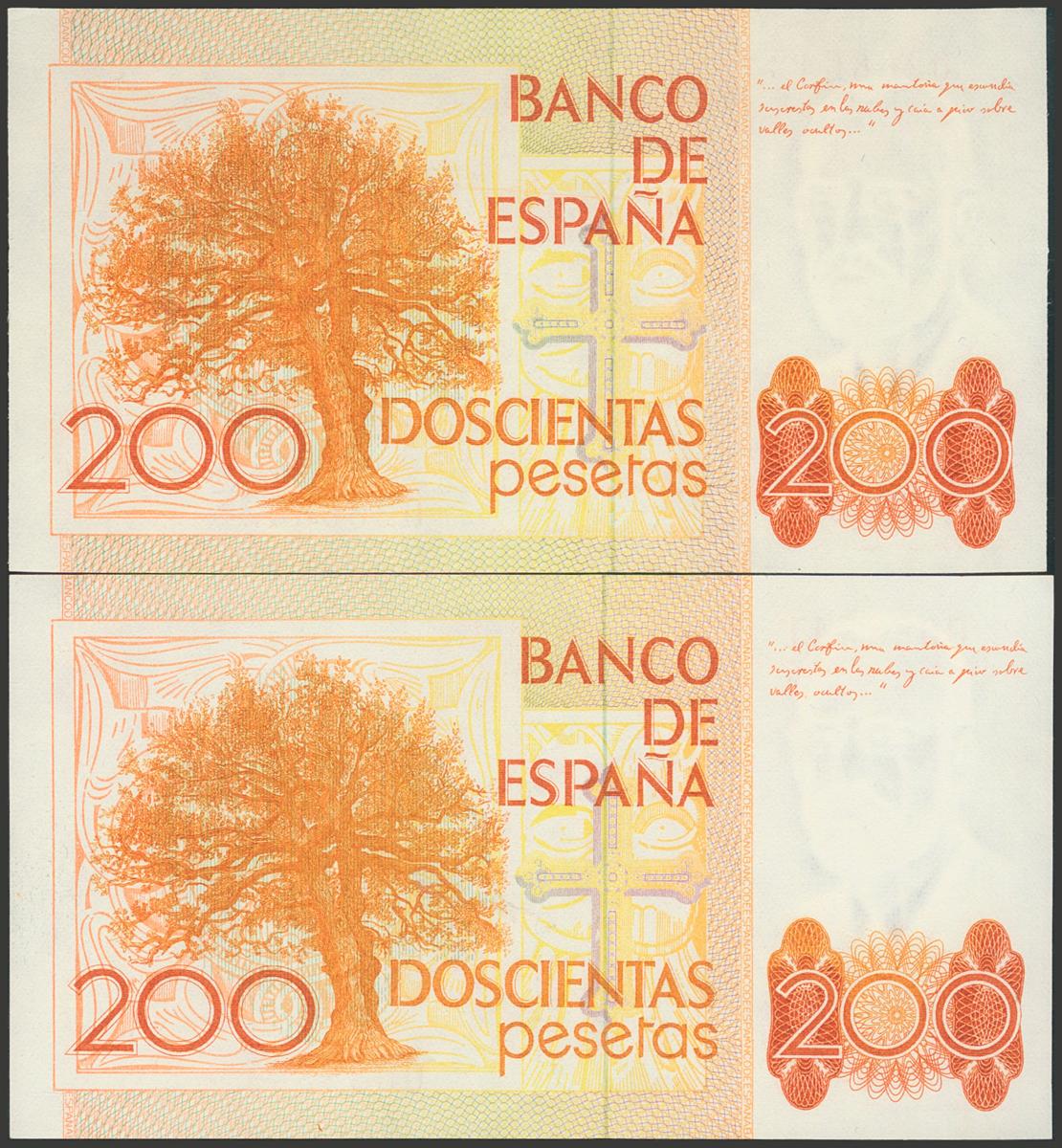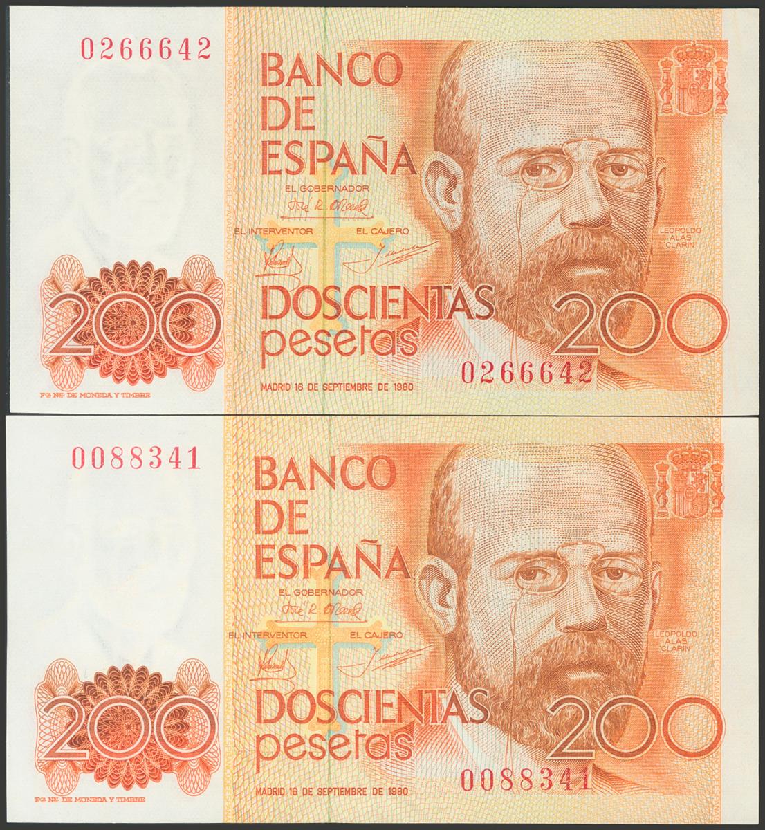Set of 2 banknotes of 200 Pesetas issued on September 16, 1980, both with low numbers, one starting with a "0" and the other with two "00". (Edifil 2017: 480). Uncirculated.