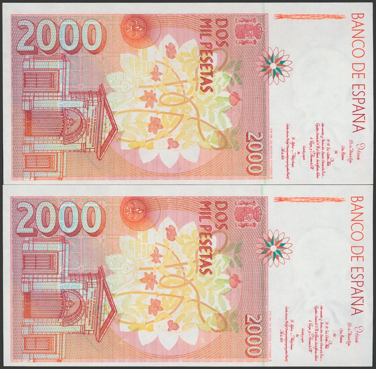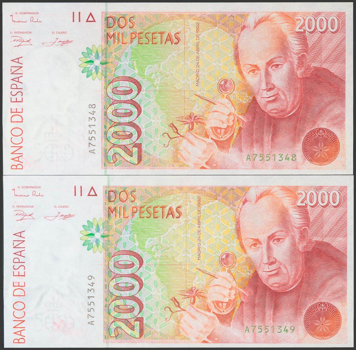 2000 pesetas. April 24, 1992. Correlative couple. Series A. (Edifil 2017: 482a). Uncirculated.