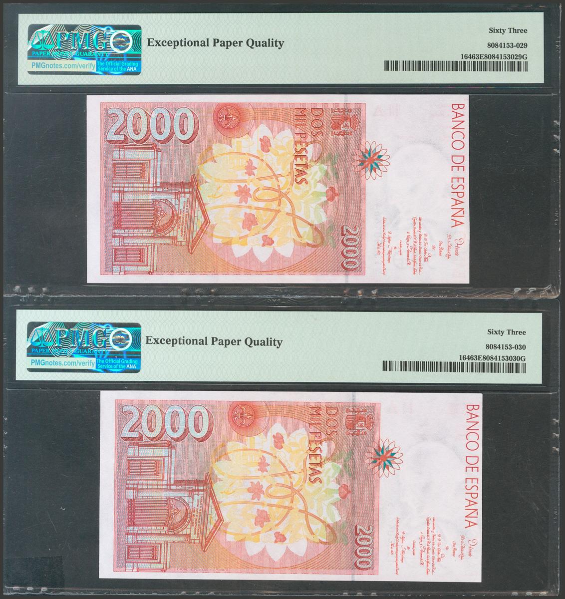 2000 pesetas. April 24, 1992. Correlative couple, one of them capicúa imperfect. (Edifil 2017: 482A). Original sizing. Uncirculated. PMG63EPQ packages, both.