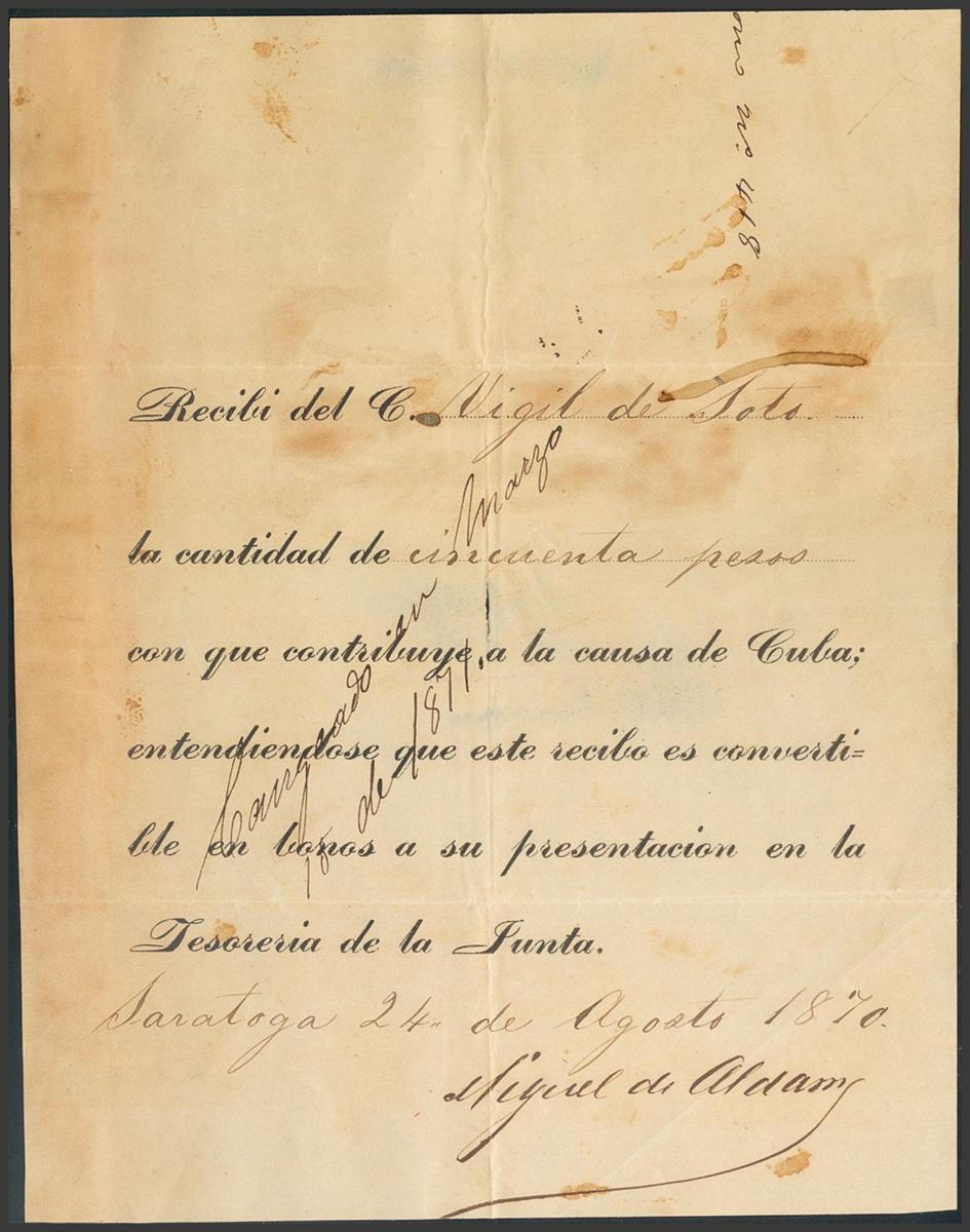 CUBA. Receipt of 50 pesos, convertible into bonds, issued on August 24, 1870 in Saratoga and signed by Miguel de Aldama, inscription "Redeemed on March 15, 1879". Very rare, piece of enormous historical load. Former José Martí Collection, auctioned in Aureo on November 17, 2004, lot No. 5919. On October 10, 1868, the Ten Years War (1868-1878) broke out, the first war for the Independence of Cuba, Aldama was involved in the conspiracies.