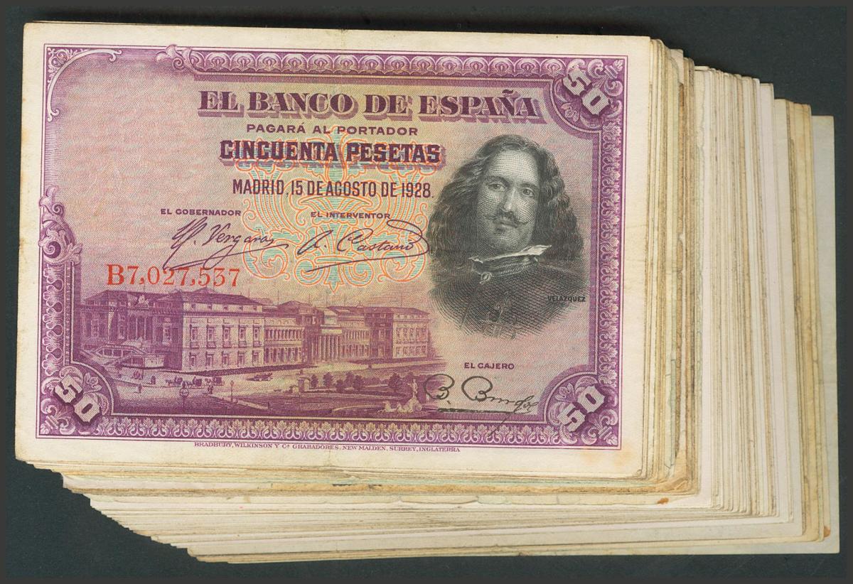 English Set of 68 banknotes of 50 Pesetas issued on August 15, 1928, without series and with different series, low or very low conservation rates. TO EXAMINE.