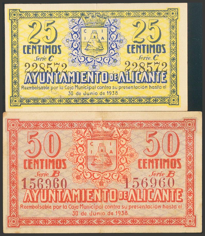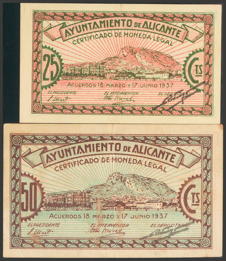 English ALICANTE. 25 Cents and 50 Cents. July 17, 1937. Series C and B, respectively. (González: 508, 509). Extremely Fine.