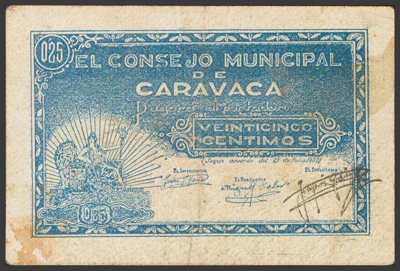 CARAVACA (MURCIA). 25 cents. (1937ca). (González: 1609). Good Very Fine.