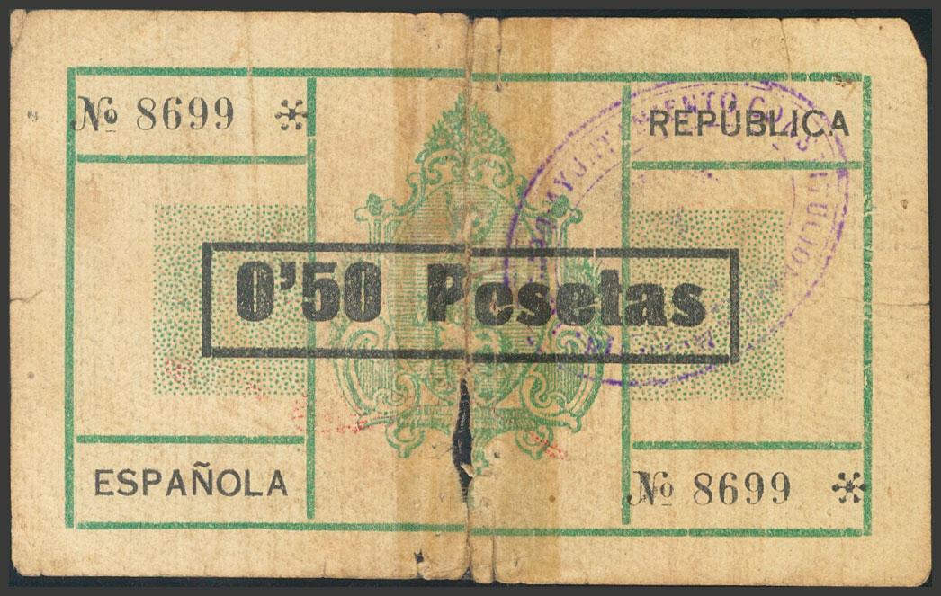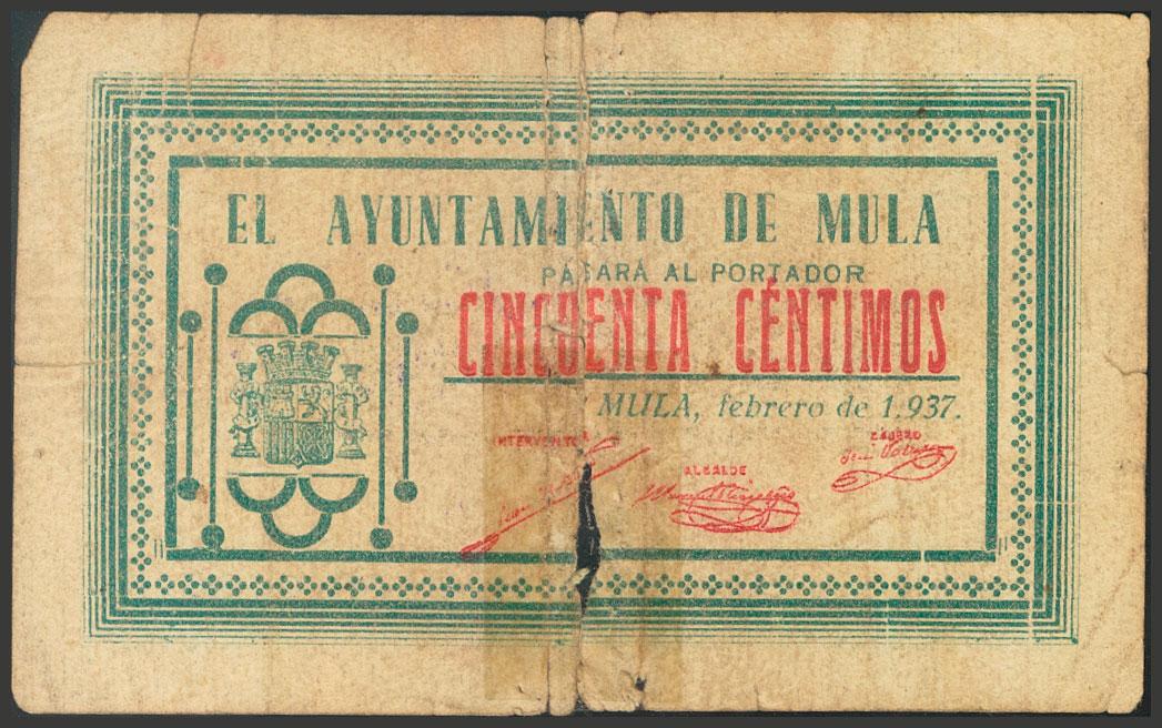 MULA (MURCIA). 50 cents. February 1937. (González: 3755). Rare, with the presence of adhesive tape joining the bill. Good.