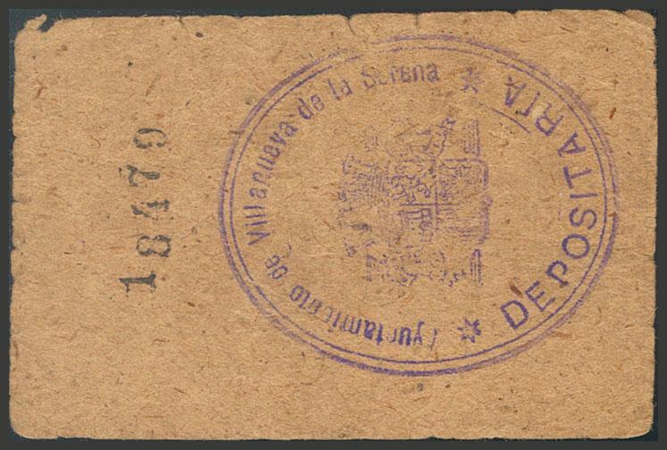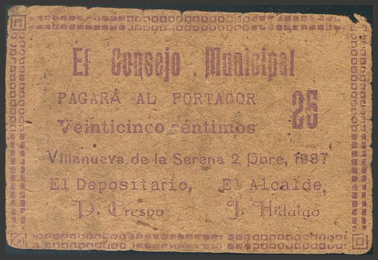 VILLANUEVA DE LA SERENA (BADAJOZ). 25 cents. December 2, 1937. (González: 5651). Unusual Fine.