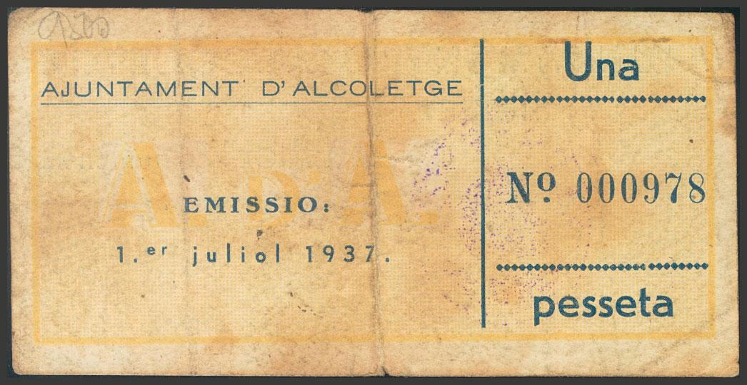 ALCOLETGE (LERIDA). 1 peseta. July 1, 1937. (González: 6142). Very rare. Very Fine.