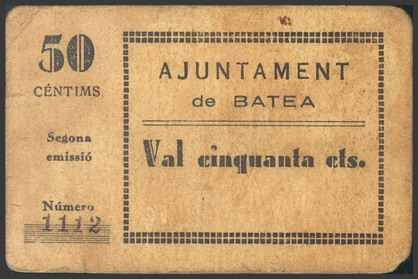 BATEA (TARRAGONA). 50 cents. (1937ca). (González: 6914). Rare Good Very Fine.