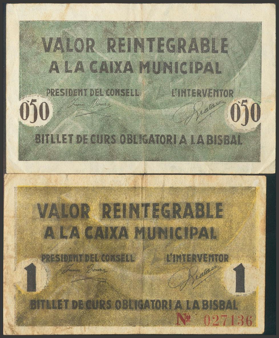 LA BISBAL (GERONA). 50 Cents and 1 Peseta. (1937ca). (González: 7062/63). Complete series. Good Very Fine.