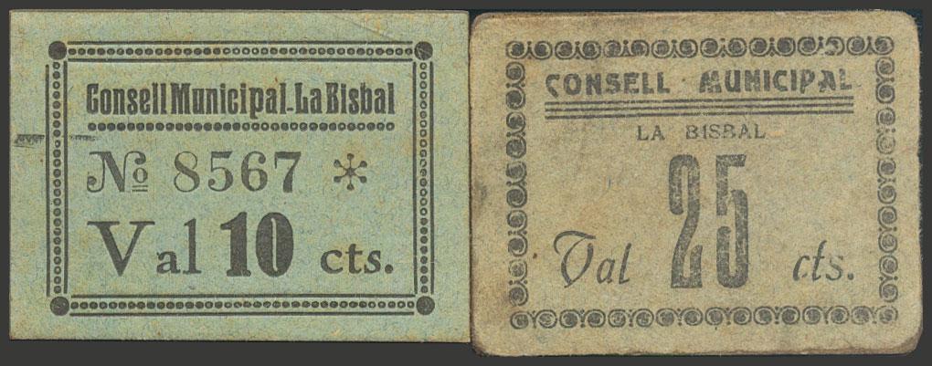 LA BISBAL (GERONA). 10 Cents and 25 Cents. (1938ca). (González: 7065, 7066). Rare Extremely Fine/ Good Very Fine.