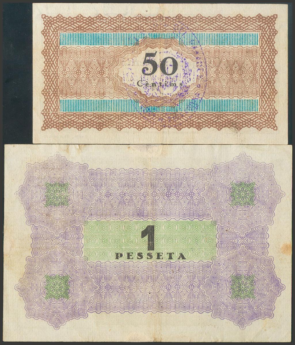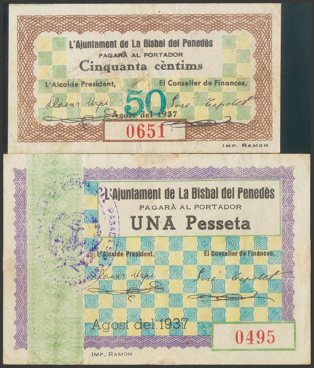 English BISBAL DEL PENEDES (TARRAGONA). 50 Cents and 1 Peseta. August 1937. (González: 7095, 7096). Unusual Good Very Fine.