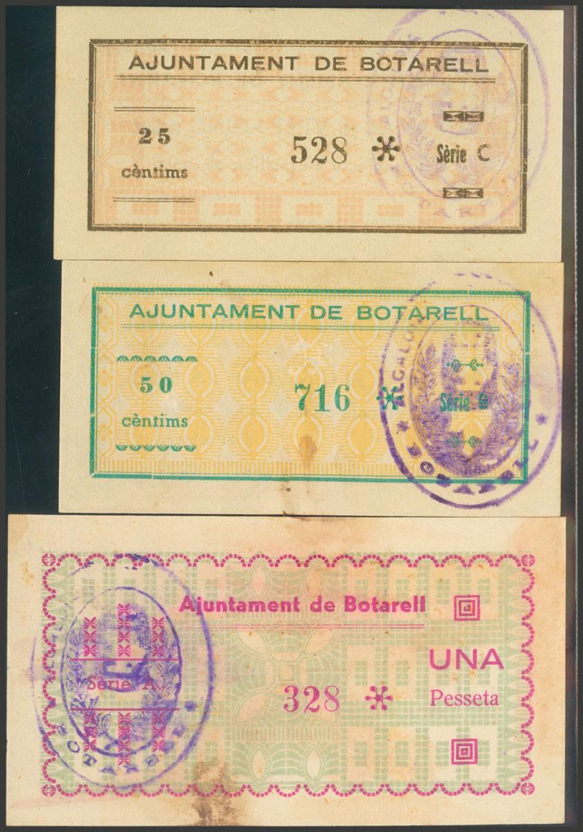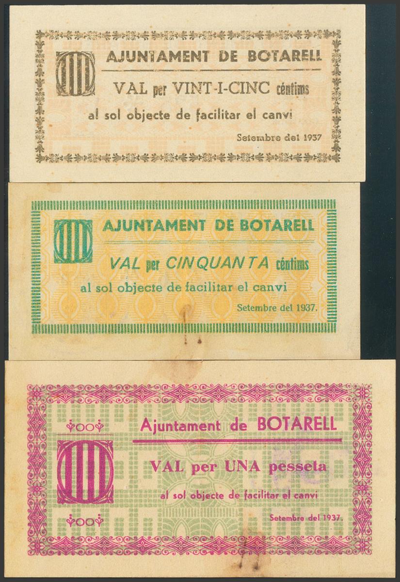 English BOTARELL (TARRAGONA). 25 Cents, 50 Cents and 1 Peseta. September 1937. Series C, B and A, respectively. (González: 7188/90). Rare complete series. Good Extremely Fine/ Almost Extremely Fine.