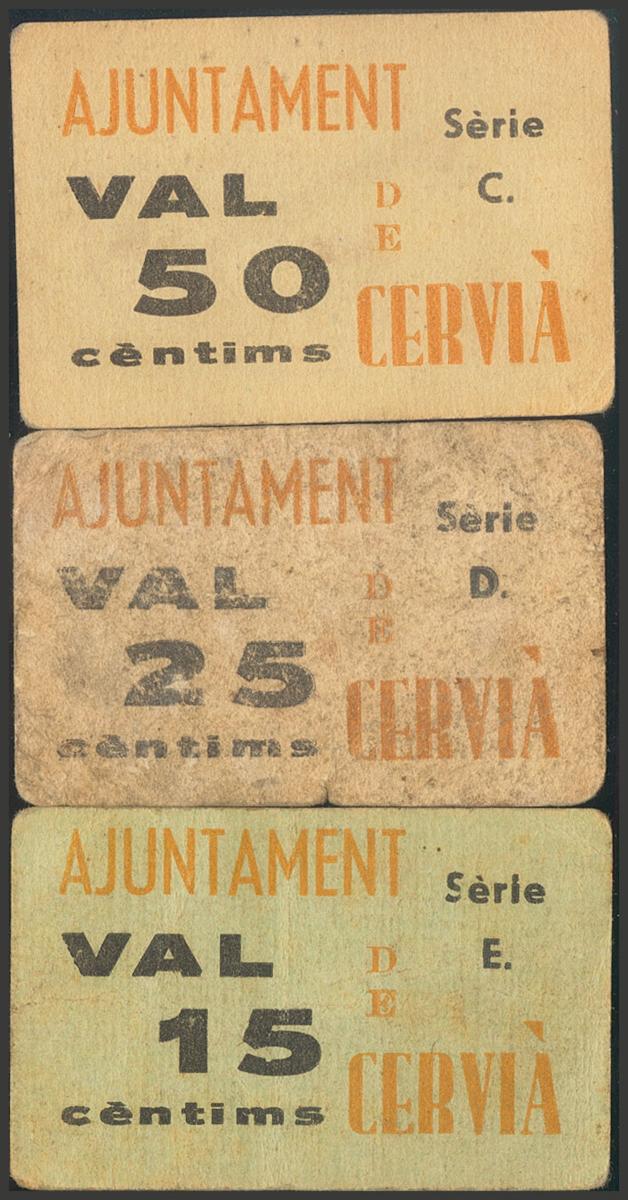 CERVIA (LERIDA). 15 Cents, 25 Cents and 50 Cents. (1937ca). Series E, D and C, respectively. (González: 7583, 7584, 7585). Rare Very Fine.