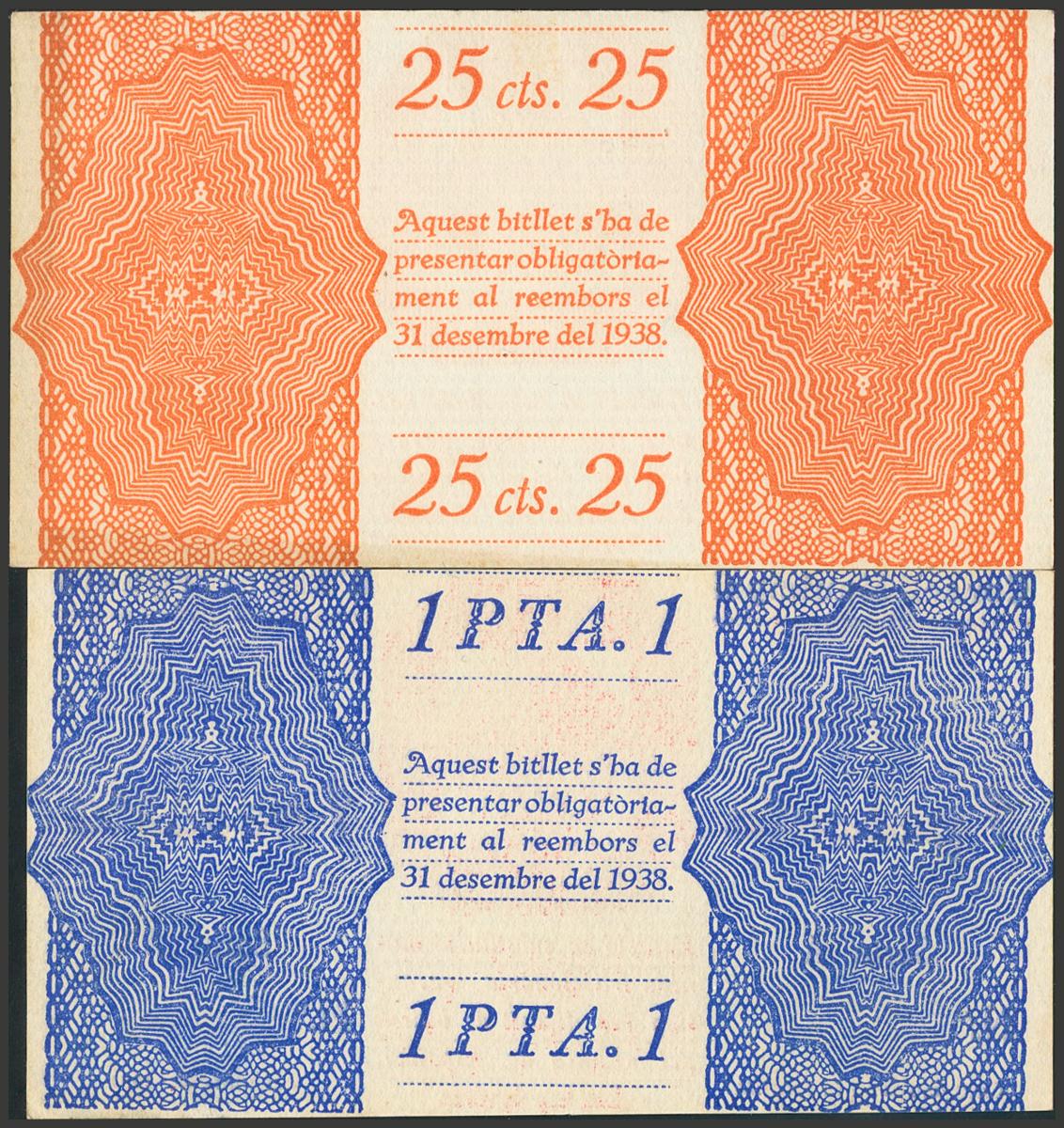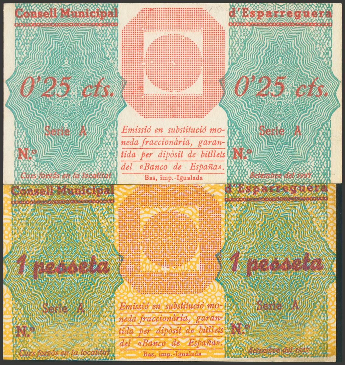 ESPARREGUERA (BARCELONA). 25 Cents and 1 Peseta. September 1937. Series A, both and without numbering. (González: 7748/49). Complete series. Uncirculated.