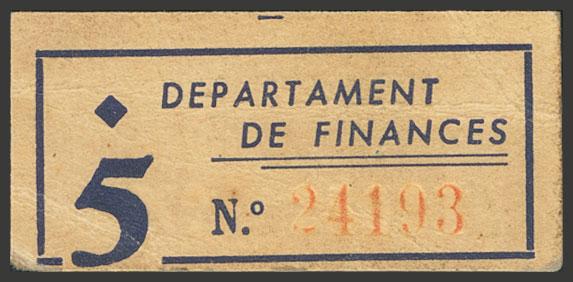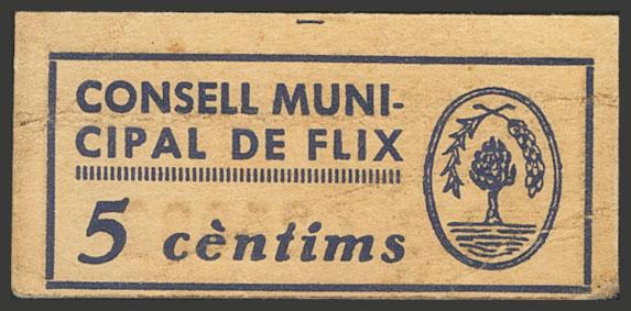 English FLIX (TARRAGONA). 5 Cents. (1937ca). (González: 7888). Unusual Extremely Fine.