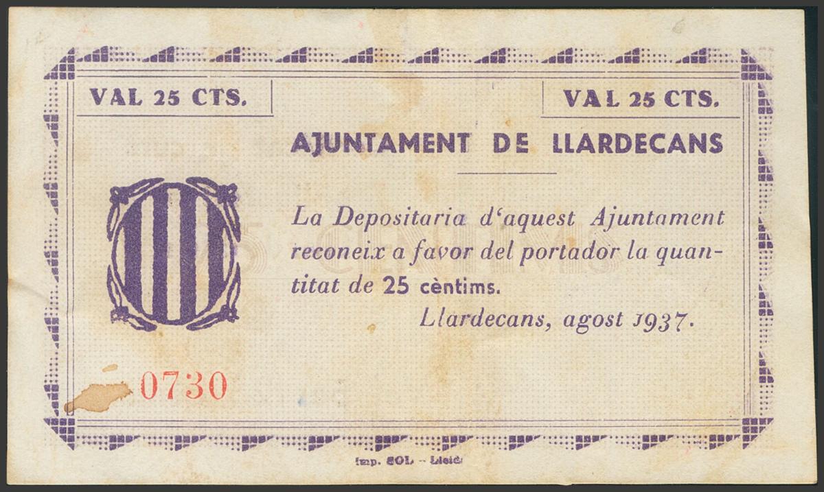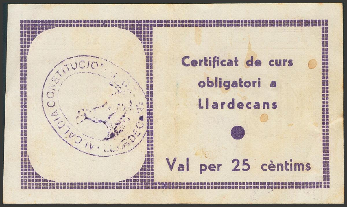 LLARDECANS (LERIDA). 25 cents. August 1937. (González: 8342). Very rare. Good Very Fine.