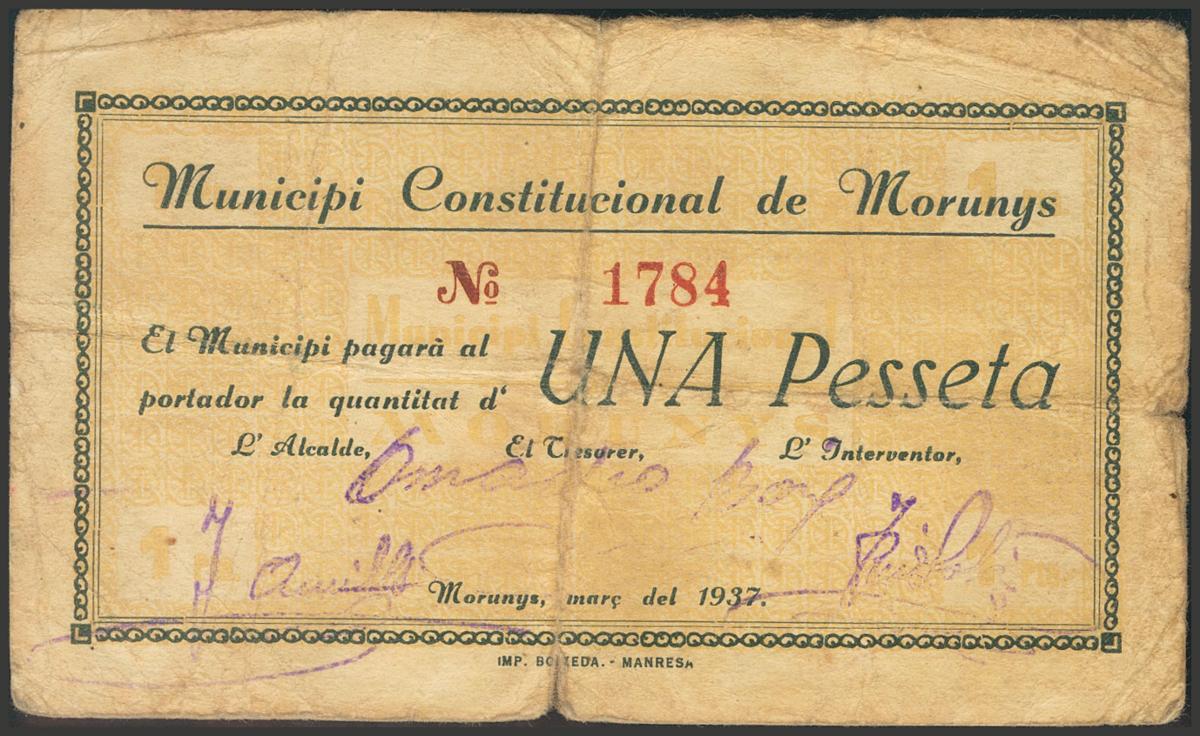 LLORENS DE MORUNYS (LERIDA). 1 peseta. March 1937. (González: 8423). Very rare. Almost Very Fine.