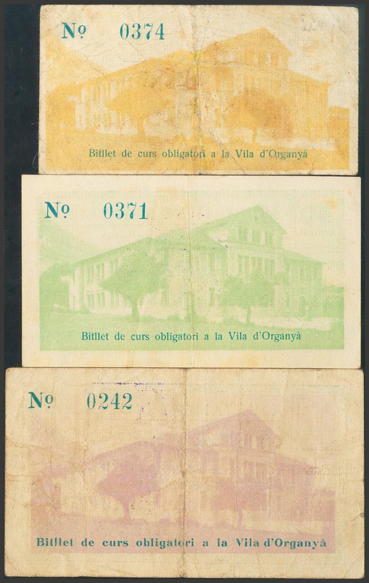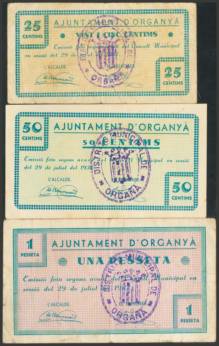 ORGANYA (LERIDA). 25 Cents, 50 Cents and 1 Peseta. July 29, 1937. (González: 9043/45). Rare complete series. Extremely Fine/ Very Fine.