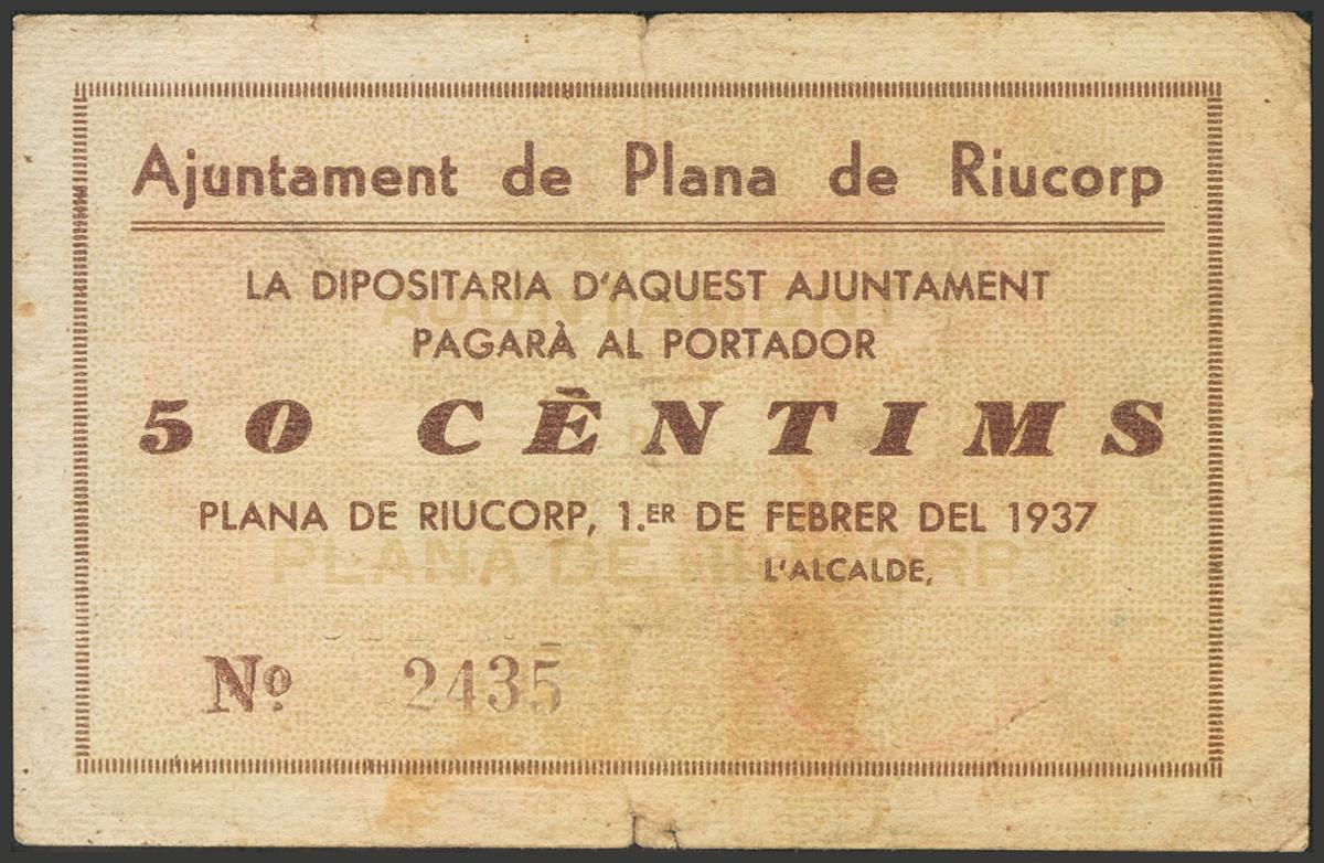 RIUCORP PLANE (LERIDA). 50 cents. February 1, 1937. (González: 9271). Very rare. Good Very Fine.