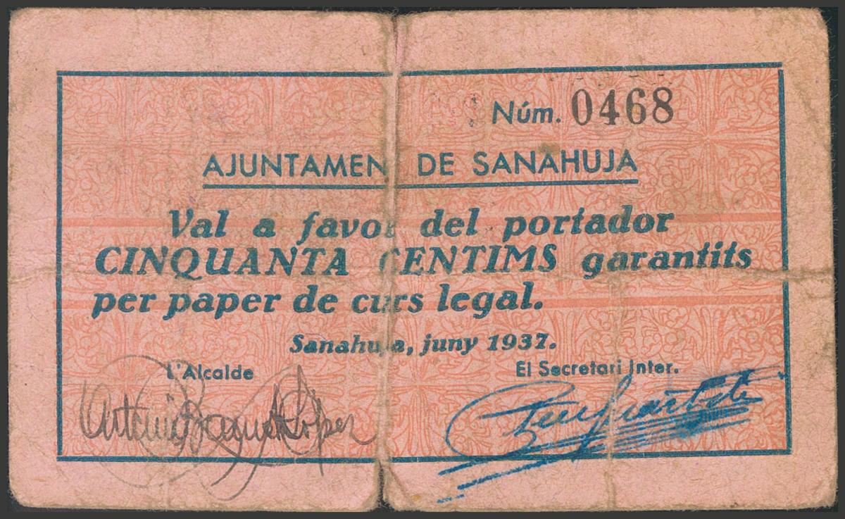 English SANAHUJA (LERIDA). 50 cents. June 1937. (González: 9486). Very rare. Good.