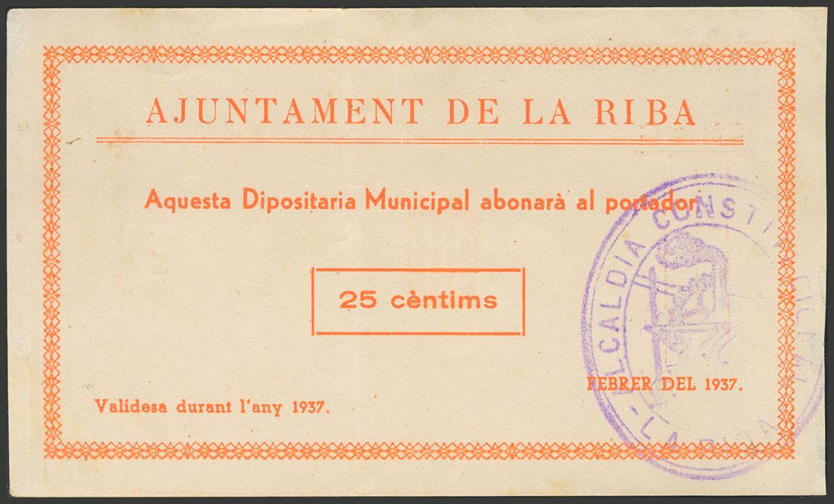 LA RIBA (TARRAGONA). 25 cents. February 1937. Series C. (González: 9597). Very rare. Extremely Fine.