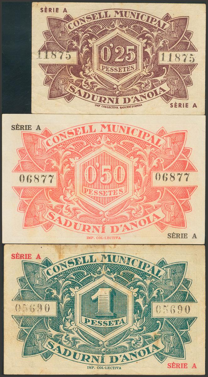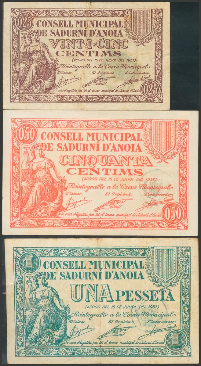 SADURNI DE ANOIA (BARCELONA). 25 Cents, 50 Cents and 1 Peseta. July 15, 1937. Series A. (González: 9804/06). Unusual complete series. Extremely Fine/ Good Very Fine.
