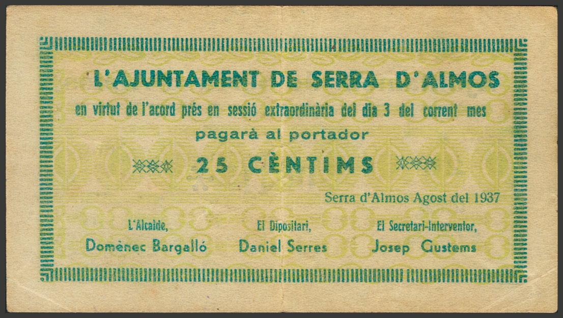 SERRA DE ALMOS (TARRAGONA). 25 cents. August 1937. Series C. (González: 9955). Rare Good Very Fine.