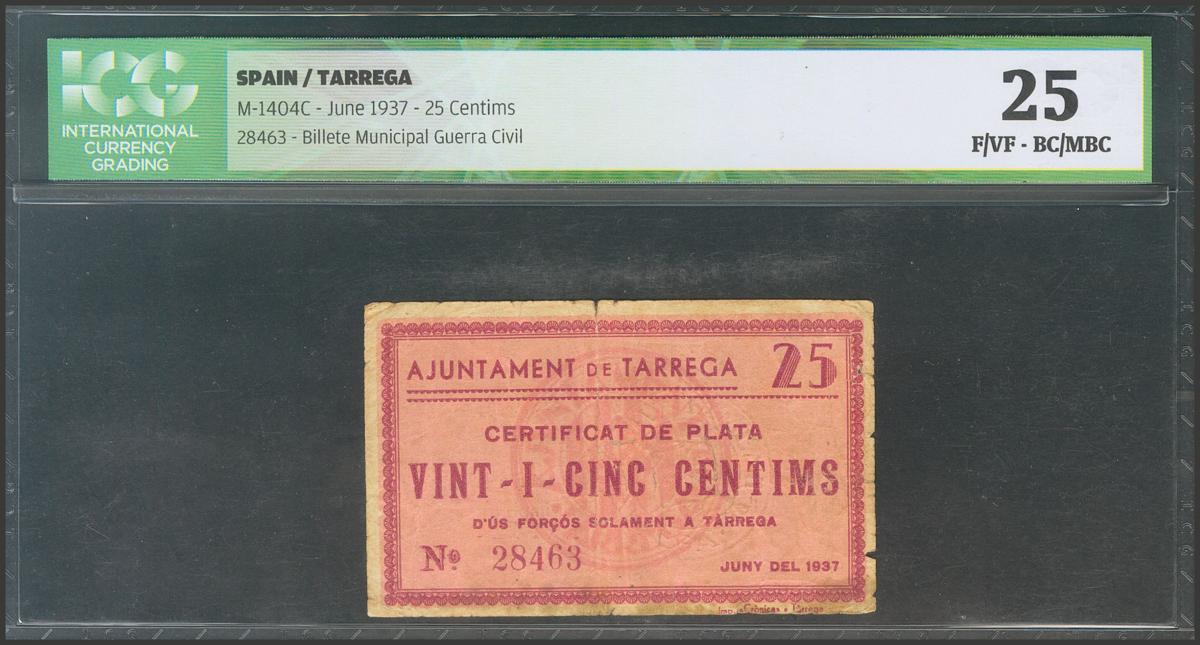 English TARREGA (LERIDA). 25 cents. June 1937. (González: 10101). Almost Very Fine. Package ICG25.