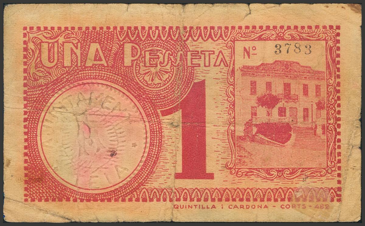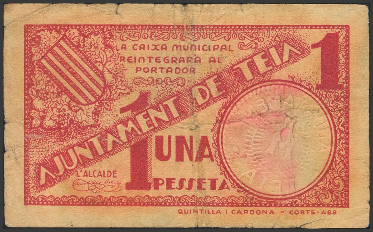 TEIA (BARCELONA). 1 peseta. (1937ca). (González: 10124). Unusual Fine.