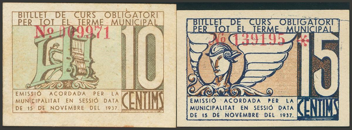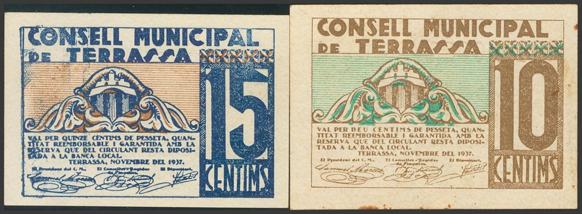 TERRASSA (BARCELONA). 10 Cents and 15 Cents. November 15, 1937. (González: 10134/35). Complete series. Uncirculated/ Good Extremely Fine.