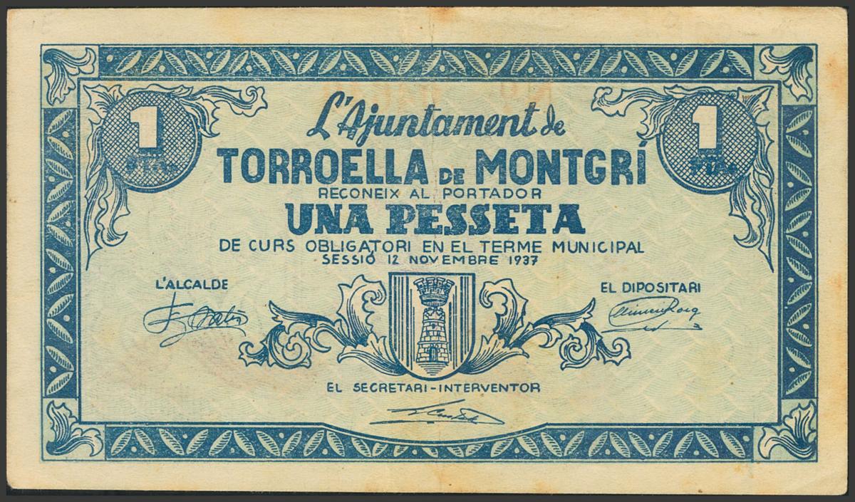 English TORROELLA DE MONTGRI (GERONA). 1 peseta. November 12, 1937. (González: 10398). Unusual Very Fine.