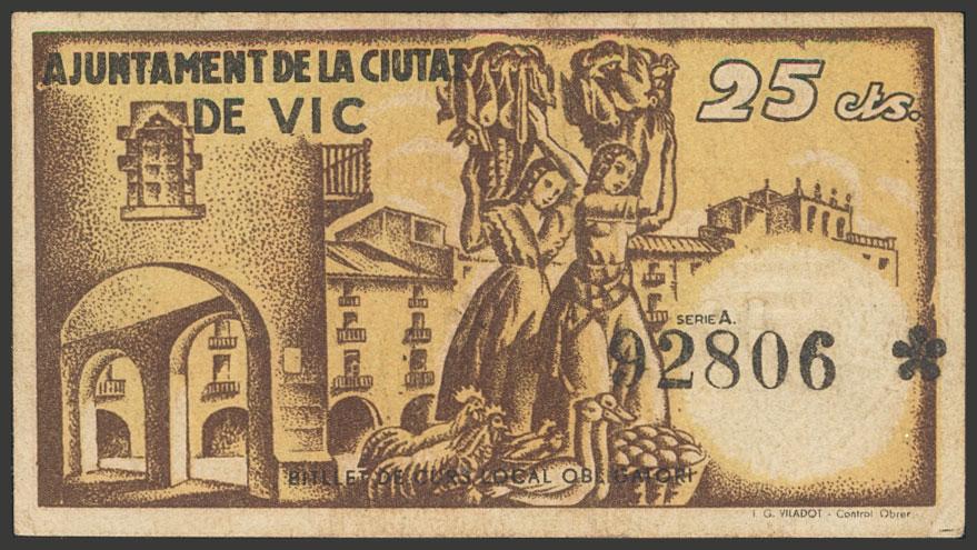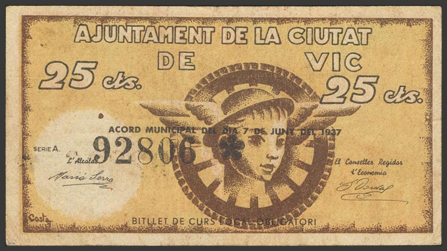 VIC (BARCELONA). 25 cents. June 7, 1937. Series A. (González: 10629). Extremely Fine.