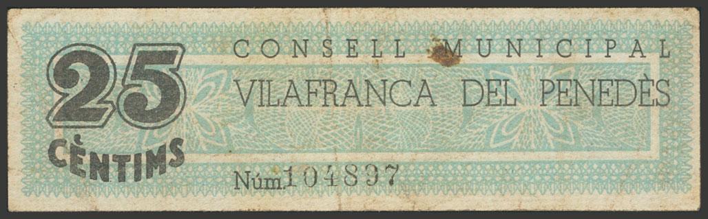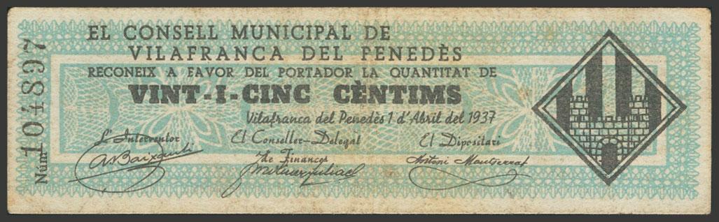 English VILAFRANCA DEL PENEDES (BARCELONA). 25 cents. April 1, 1937. (González: 10708). Very Fine.