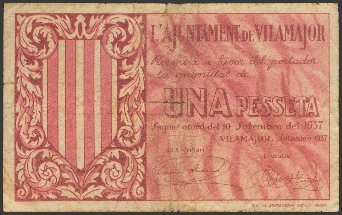 English VILAMAJOR (BARCELONA). 1 peseta. September 10, 1937. (González: 10770). Rare Very Good.