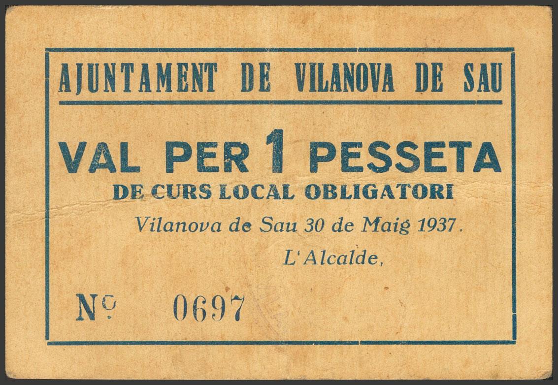 VILANOVA DE SAU (BARCELONA). 1 peseta. (1937ca). (González: 10822). Rare Good Very Fine.
