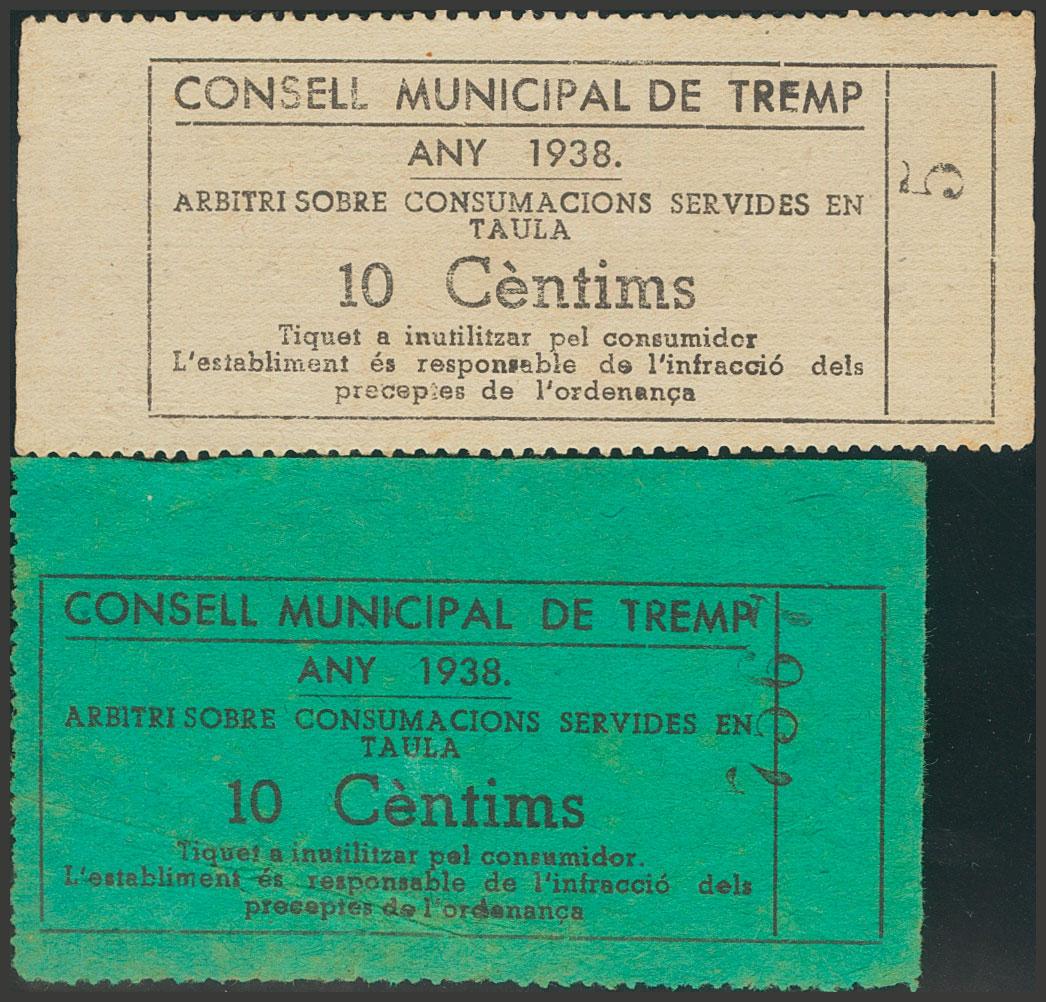 Set of 2 vouchers of 10 Cents issued in 1938 in Tremp (Lleida) on the maintenance of the Public Service. Good Extremely Fine.