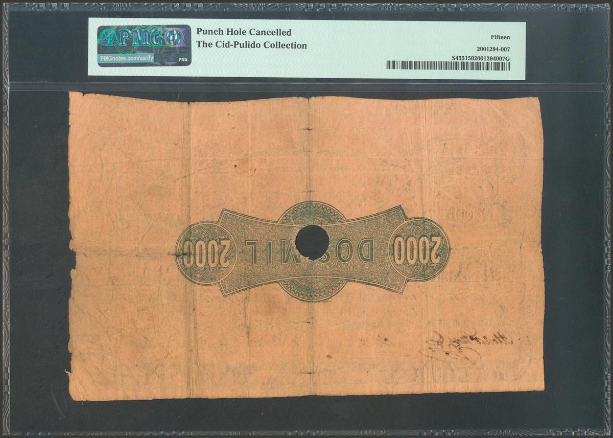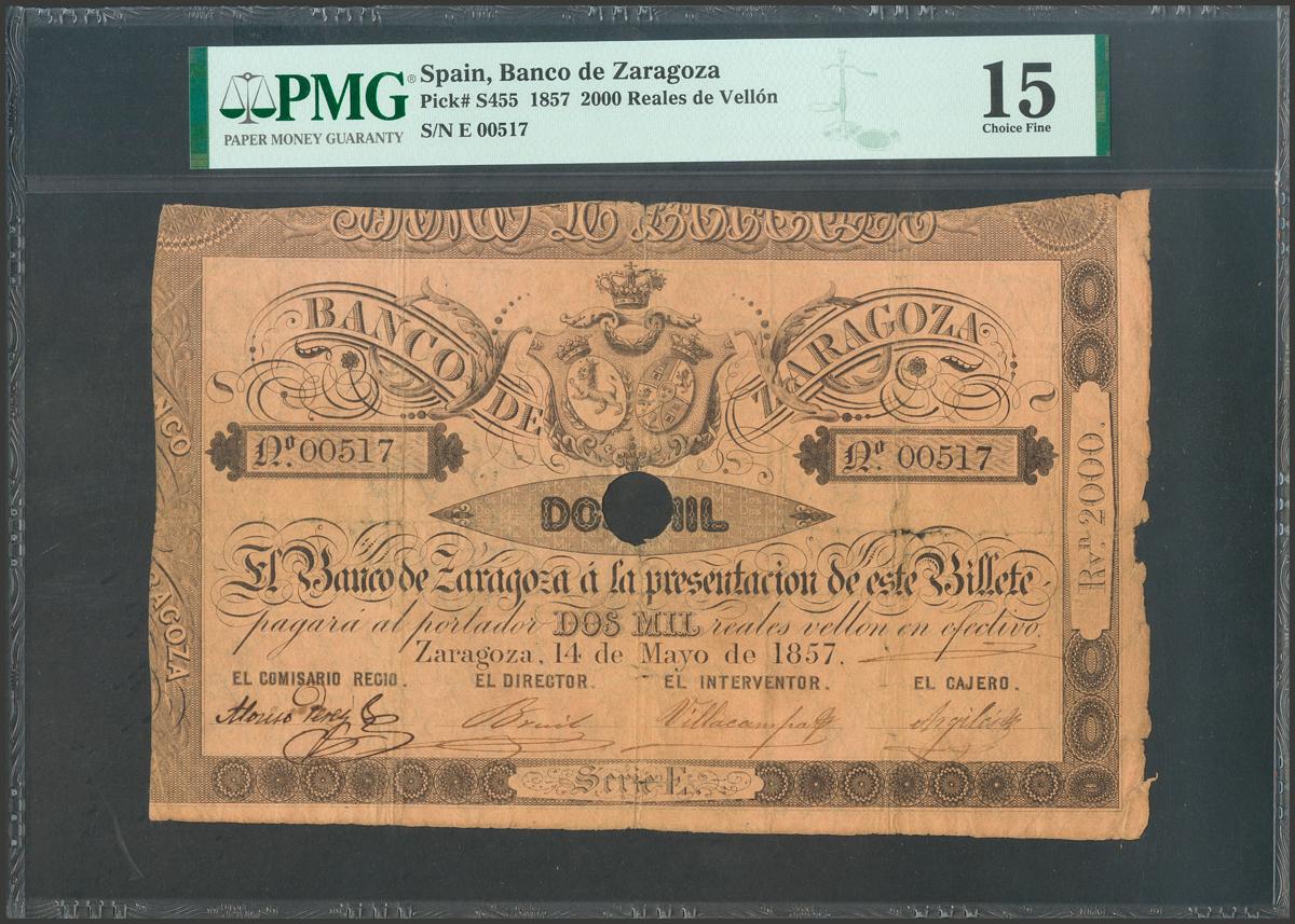 2000 Reales. May 14, 1857. Bank of Zaragoza. Series E, with holes and signatures. (Edifil 2017: 130). Fine. Packaged PMG15.
